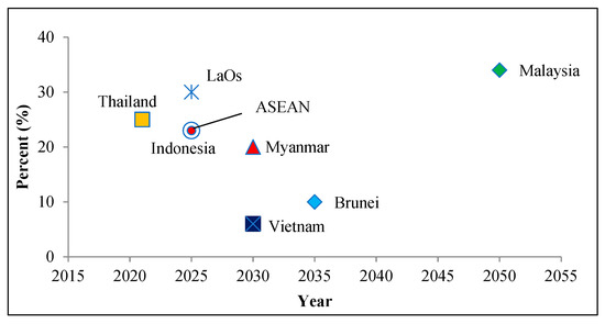 Figure 4 illustrates the potential share of renewable energy in the selected ASEAN member countries. Depending on the availability of the renewable energy sources within the countries such as forest resources, agriculture resources, hydropower, solar energy, wind energy, geothermal energy, etc., the different countries have different shares of renewable energy to their major energy supply within their projected years. Regarding the research studies by the scholars [10,16,17,18] on the renewable energy resource assessment of the ASEAN member countries, the target of renewable energy of the countries are described as follows: The target of renewable energy in Thailand is aimed at 25% of total energy consumption by 2021. Out of this, 4390 MW of power generation is planning to be gained from bio-energy sector. In Vietnam, the target of the country related to the energy sector is to increase the share of renewable energy from 3% in 2010 to 6% in 2030. Among the renewable energy sources in Vietnam, wind energy, solar energy, and bio-energy are playing a key role. In Cambodia, as a major biomass source for electricity generation, rice husk from agricultural wastes might contribute one million tons per year to generate 60–100 MW capacity. Meanwhile, old rubber trees could also generate 20–50 MW capacity. In Laos PDR, with an abundance of the forest resources, fuelwood is crucial in providing the energy around the country, accounting for about 88% of total energy needs. The projected power generation from biomass could increase from approximately 13 MW in 2015 to 58 MW in 2025. In Myanmar, the share of renewable energy to the total installed capacity is planning to reach 15–20% for the electricity sector by 2030, regardless of hydropower. Meanwhile, the contribution of biomass in Myanmar is projected to around 50% of the total energy supply. The total potential of renewable energy in ASEAN is estimated at approximately 23% in 2025.