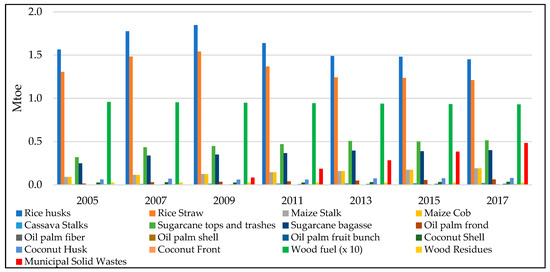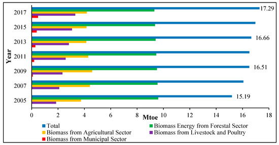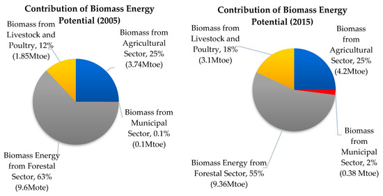 Figure 7 shows the contribution of biomass energy potential from the different sectors in Myanmar in 2005 and 2015. It was found that the majority of the total biomass energy potential in 2005 came from the forest sector, with 63% of the total. However, its contribution decreased slightly to 55% in 2015, due to a forest conservation program of the country. The second most biomass energy contribution came from the agricultural sector, with 25% of the total during 2005–2015, respectively. The total biomass energy potential in Myanmar was estimated at 15.19 Mtoe in 2005 and 17.29 Mtoe in 2017 respectively (Figure 8).