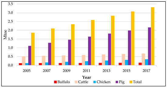 Figure 6 shows the biomass energy potential from the livestock and poultry sector. Although Myanmar is planning to shift from traditional agriculture economy to industrialized agriculture economy, the former is still being conducted in several parts of the country. Besides, poultry farming also remains common around the country. It was estimated that the total biomass energy potential from the livestock and poultry sector amounted to approximately 1.85 Mtoe in 2005 and 3.3 Mtoe in 2017, respectively.