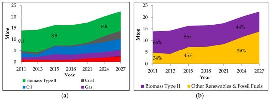 According to Myanmar Energy Master Plan [10], as shown in Figure 9a, the total projected energy supply from the energy sources in Myanmar had around 16 Mtoe in 2015 and 22 Mtoe in 2027, respectively. Out of this, the major energy supply might come from biomass type II (fuelwood) (Figure 9b). However, due to deforestation and a strategic program to reduce the consumption of fuelwood and to promote the utilization of alternative energy sources by 2030, there might be a slight decrease in the biomass energy supply to the total projected energy since 2011. As a result, the contribution of the biomass energy to the total projected energy supply might decrease from approximately 55% in 2015 to 44% in 2024 (Figure 9b).