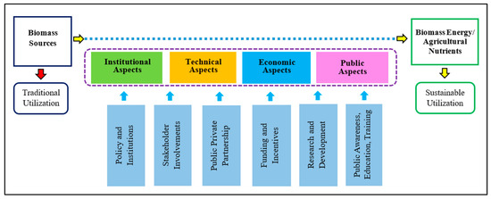 Currently, Myanmar majorly use traditional practices in consuming the biomass sources such as traditional consumption for heating and cooking, traditional agriculture nutrients, open burning, open disposal, animal feeds, etc. On the other hand, although the efforts and initiatives of the government sector have been made to promote the development of biomass energy in Myanmar, there are still some constraints and barriers that biomass energy utilization could not be easily achievable. The major constraints and barriers for the development of biomass energy sector might come from the four major aspects; institutional aspects, technical aspects, economic aspects, and public aspects (Figure 11), which could be potentially overcome through the possible solutions (policy and institutions, all stakeholder involvements, public private partnership, research and development, funding and incentives, and public awareness, education and trainings), as stated by [33]. The four major aspects and recommendations are highlighted as follows: