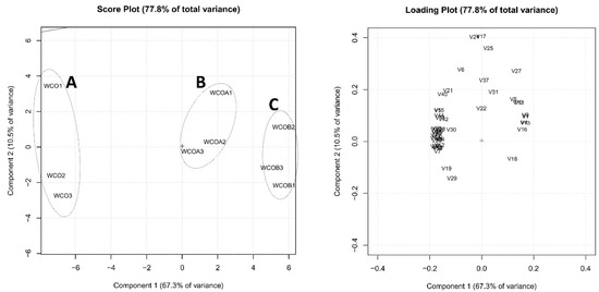 Score plot (left) and loading plot (right). A: WCO; B: WCO1; C: WCO2.