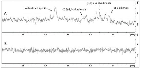 Comparison 1H NMR (aldehydes portion of the spectra) between crude (WCO) (A) and filtered samples (WCO2) (B).