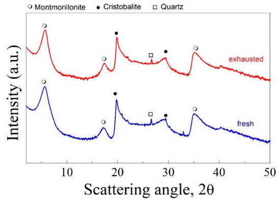 XRD profile of samples of fresh and exhausted bentonite.