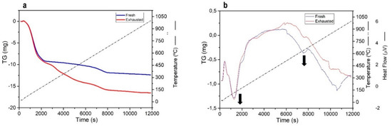 The TG profile (Figure 5, left) shows two main endothermic peaks indicative of mass loss related to the elimination of water for both samples. One, between 60 and 150 °C, corresponding to the 15% of the total initial mass, can be referred to the physically adsorbed water, which is lost in an amount of 9.23 mg. The second event, between 600 and 750 °C, can be related to the condensation of the oxidryl structure, expulsed in the form of water [51]. Similar results have been observed in the case of Brazilian [52] and Turkish [53] bentonites. Even though a similar loss of water is recorded in both of our samples in the temperature range 60–150 °C, a clear difference can be observed for the two systems at higher temperatures. This difference, roughly 7 mg (200–1000 °C), can be ascribed to the quantity of residue adsorbed into the pores of the bentonites during the filtration treatment, further confirming the benefit of filtration. The DSC profile (Figure 4, right) shows a clear endothermic event peak at 105 °C. Other thermal events were also observed at higher temperatures: 600 °C (fresh and exhausted samples) and 810 °C (exhausted sample). Even though these events could be associated with the condensation of the oxidryl groups and with the decomposition of the adsorbed residues, a proper determination needs further efforts in terms of characterization and will be addressed in a future work.