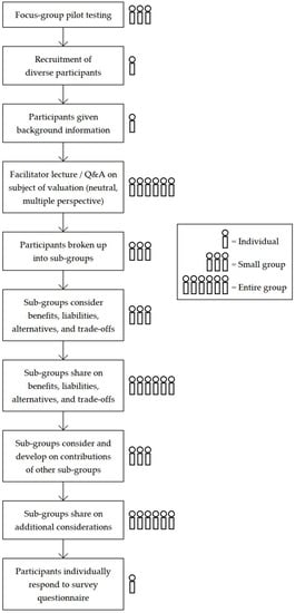 Drawing on decision analysis, behavioral decision research, and the deliberative valuation work of Gregory and Keeney (2000), McDaniels et al. (2003), and Dietz et al. (2009), this paper proposes a possible framework for such a minimalist form of deliberative valuation, consisting of a short, structured group deliberation, followed by an individual valuation exercise [12,35,48]. The minimization of time would help to alleviate problematic differences in participation that minimize the voices of marginalized groups, while the minimization of cost would allow for a higher number of deliberative groups to be conducted, eliminating the problems of trying to represent an entire population with a few dozen participants. An outline of this proposed framework can be seen in Figure 1.
