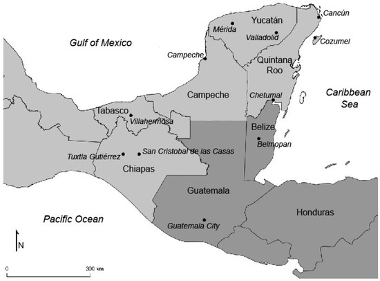 With a deforestation rate in its tropical forests of more than 2% each year (a loss of an average of 263,570 ha/year) between 1976 and 2000, Mexico has lost more than 95% of its original tropical forest cover in that period [53,57,62,63,64,65,66]. Unlike in the Amazon basin, the majority of deforestation in Mexico is not attributable to commercial logging, mining, or ranching interests, but primarily to pioneering smallholders moving from overpopulated highland areas to low-density tropical lowlands and clearing land, and, to a lesser extent, to the expansion of existing lowland ejidal communities into surrounding state or communally-managed forest areas for additional farming land and grazing pasture [53,62,67,68,69,70]. A map of South-East Mexico can be seen below, in Figure 2.