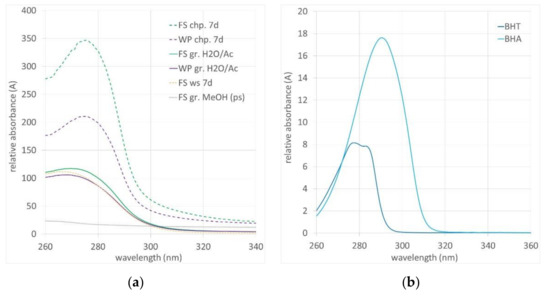 (a) Average relative UV absorbance of Aesculus Hippocastanum L. seed coat and peeled seed extracts. Measurements were recorded in triplicate. No relevant absorbance above 360 nm was measured. FS: Field samples; WP: Phytopharmaceutical waste products; chp.: passive extraction of chopped seed coats; gr.: grinding extraction of seed coats (or peeled seeds (ps), if stated); ws: passive extraction of whole seeds; 7d: Extraction duration of 7 days; H2O/Ac: Extractant water/acetone (1:1 v/v); MeOH: extractant methanol. (b) Average relative UV absorbance of BHT and BHA solutions. Measurements in triplicate. No relevant absorbance above 360 nm was measured. BHT: Butylated hydroxytoluene; BHA: Butylated hydroxyanisole. Solvent: methanol; concentration: 1.0 mg mL−1.