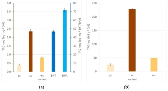 (a) Total antioxidative capacity (TAC) of synthetic antioxidants BHT and BHA and Aesculus Hippocastanum L. peeled seeds, seed coats, and whole seeds extracted by grinding extraction. Extracts: primary ordinate, given in shades of brown, measurements in triplicate; BHT/BHA: Secondary ordinate, depicts in shades of blue, six measurements. Standard deviation indicated by error bars. Teq: Trolox equivalents; DM: Dried sample mass; ps: Peeled seed; sc: Seed coat; ws: Whole seed; BHT: Butylated hydroxytoluene; BHA: Butylated hydroxyanisole. (b) Total phenolic content (TPC) of Aesculus Hippocastanum L. peeled seeds, seed coats and whole seeds extracted by grinding extraction. Measurements in triplicate, standard deviation indicated by error bars. GAE: gallic acid equivalents; dm: dried sample mass; ps: peeled seed; sc: seed coat; ws: whole seed.