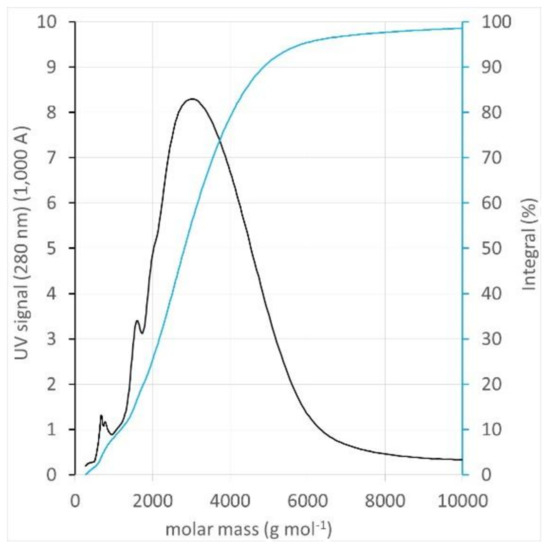 The molar mass distribution of AEH seed coat extracts and the corresponding integral curve are plotted in Figure 3. The applied detection wavelength of 280 nm is considered characteristic for polyphenols [10]. Consequently, we assumed that the sample contained polyphenols in varying molecular sizes that are well displayed in the UV signal at 280 nm. The smallest 10% of the substances in the extract had a molecular weight below 1176 g·mol−1, whereas the biggest 10% had a minimum molar mass of 4862 g·mol−1. The number average molecular weight was 2097 g·mol−1, and the molecular weight at the peak maximum was 2989 g·mol−1. The weight average molecular weight of the compounds extracted from seed coats was determined to be 3095 g·mol−1. This corresponds to approx. 10 condensed catechin molecules, neglecting possible condensations of other compounds. An average molecular weight of 1750 g·mol−1 was determined by Czochanska et al. for PAs extracted from ground whole AEH seeds by analyzing the terminal group ratio after thiolysis using 13C NMR [31]. The shift to a higher number average molecular weight compared to those results is reasonable as they are based on extracting the whole seed, including the inner seed, which is known to contain high amounts of substances with a significantly lower molecular weight than the seed coats’ PAs, possibly including smaller polyphenols [29,32]. With molar masses ranging from approximately 1100 to 2600 g·mol−1, the masses obtained from AET seed coat extract analysis are lower than the results for the AEH counterparts [11]. However, the dimensions are similar. As a high molecular weight is preferred for substances used in food contact materials due to a reduced migration risk, the SEC results underline the potential of AEH seed coat extracts [33].
