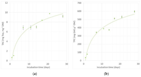 In the passive extraction setup using whole, unprocessed seeds, the TAC rapidly increased for the first seven days as shown in Figure 5a. After seven days, a TAC of 3.71 mg Teq·mg−1 DM was measured. Afterward, the average TAC value increased less steeply, but steadily, until it reached 7.05 mg Teq·mg−1 DM after 28 days of incubation. A similar TPC development of the extracts is illustrated in Figure 5b. After a rapid increase during the first seven days of incubation, a TPC of 343 mg GAE·g−1 DM was obtained. In the later course, a weak, but steady increase occurred up to a TPC of 596 mg GAE·g−1 DM after incubation for 28 days. The slopes of the extraction characteristics of whole seeds match a saturation curve that has not yet reached stagnation. As stated before, no sign of stagnation was observed during this experiment with a seed coat to solvent ratio of approx. 1:12, suggesting saturation at a ratio between 1:4 and 1:12.