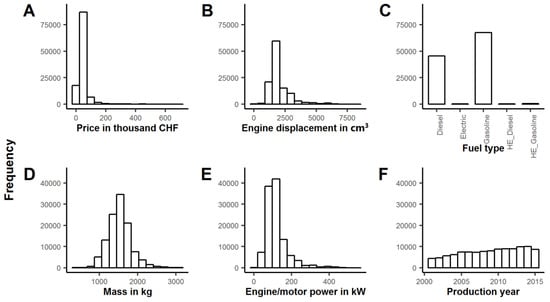 Distribution of cars in the dataset by: (A) price, (B) engine displacement, (C) fuel type, (D) mass, (E) engine/motor power, and (F) production year. Note the y-axis scale difference between the two rows of plots. The distribution of cars by the remaining eight characteristics is presented in Figure S1 of the SI.
