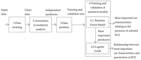 The most important car characteristics relating to the presence of the ECS in group A in cars were identified by calculating the Gini variable importance measure (Gini VIM) after fitting a random forest model to the dataset. The relationship between the above characteristics and the penetration of ECS in group A was identified by fitting a logistic regression generalized additive model (Logistic GAM) to the dataset.