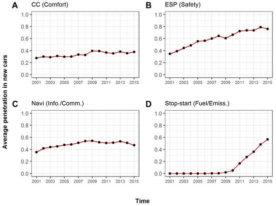 Figure 3A shows the average penetration of the cruise control system (CC), which is included in vehicles with the purpose of keeping the car’s speed at a predefined level [30]. It can be observed that even though the CC was present in cars during the 14 years of analysis, its penetration remained close to 40% for the entire period. Considering that the CC was first introduced towards the beginning of the 1990s [30,31], and that the proportion of high-end car classes in the dataset was about 50% (see the sum of “luxury”, “upper class” and “upper middle class” cars in panel A of Figure S1 in the Supplementary Information), this implies that even after 25 years on the market the CC has still not penetrated beyond the high-end car classes.