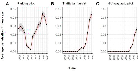 Essentially, the penetration of all ECS in group B remained well below 5% during the study period. The traffic jam assist (Figure 4B) started penetrating in 2009 while the highway autopilot (Figure 4C) started penetrating in 2012. Both penetrations still remained below 5% and 3% in 2015, respectively. This is in agreement with the early state of innovation for these technologies as well as with current safety regulations restraining the broad use of autonomous cars [39,40].