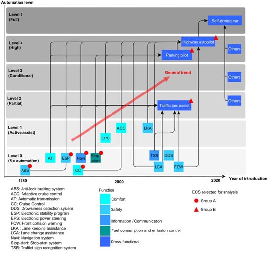 The ECS in both groups are however related. Specifically, ECS in group B build upon ECS in group A by integrating them into cross-functional systems. To understand this relationship, it is useful to think in terms of the hierarchical networked structure of automobile ECS as defined by Restrepo et al. [8]. Under this structure, the emerging ECS in group B enter the ECS network as higher hierarchical entities to which existing ECS in group A subordinate. In terms of the car’s automation level as defined by SAE International (Society of Automotive Engineers) [24], established ECS in group A belong to the lowest automation level (Level 0—no automation), while new ECS in group B belong to higher automation levels (Levels 1 to 5—active driver assistance, partial automation, conditional automation, high automation, and full automation, respectively).