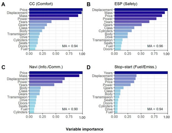 Importance of car characteristics for estimating the presence of established automobile ECS: (A) cruise control (CC), (B) electronic stability program (ESP), (C) navigation system (Navi) and (D) stop-start system. Variable importance is given relative to the maximum. A value close to one indicates an important variable. The most important variables are displayed in darker shades of blue. MA = Model Accuracy.