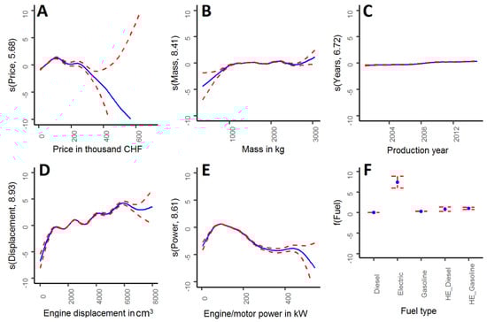 Figure 8A indicates that, holding all other variables fixed, the penetration of the CC rapidly increases with the price for cars of prices less than 100,000 CHF, which is most cars in the dataset (and in general). This is in agreement with the fact that the CC is a comfort system, therefore more likely to exist as a standard feature in cars of higher price ranges. The flattening and subsequent decrease of the curve above 100,000 CHF is likely due to a small number of specialized cars found in this range and for which the CC is less common (e.g., sports cars). The CC also seems less common for small cars of masses < 1000 kg (Figure 8B). Except for local wiggles, Figure 8D indicates that the penetration of the CC increases rapidly with the engine displacement: the larger the engine of the car the more likely it is to contain a CC. Regarding the engine/motor power of the cars, Figure 8E indicates that the penetration of the CC is highest for cars of engine/motor power around 100 kW. Likewise, the CC seems more likely to exist in electric cars than in hybrid and conventional cars (Figure 8F). The production year of the cars (Figure 8C) explains very little of the penetration among different car models, compared to other characteristics, such as displacement, mass, and fuel type.