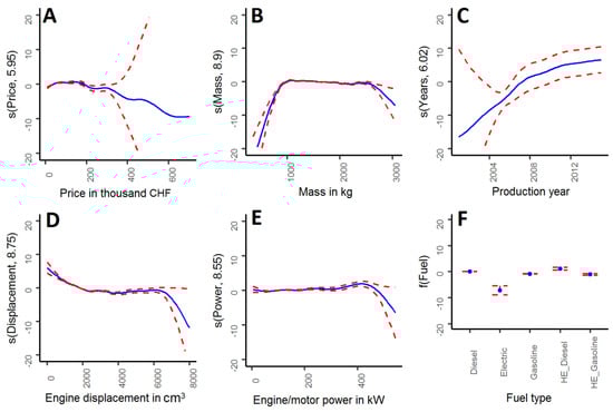 Relationship between car characteristics and the presence of the stop-start system in new cars. The blue lines represent the smoothing splines fit to each predictor after a Logistic GAM: (A) price, (B) mass, (C) production year, (D) engine displacement, (E) engine/motor power, (F) fuel type. The red dotted lines correspond to the confidence interval of the estimated function. The scale of the y-axis corresponds to the model transformation of the response variable and it is not given in the units of the response; the value in parenthesis indicates the degrees of freedom of each function (smoothing spline). The model’s validation accuracy was equal to 0.87.