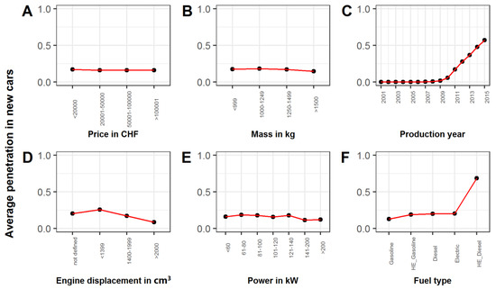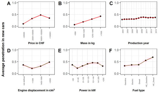 Average predicted penetration of the stop-start system in the validation set by the car’s: (A) price, (B) mass, (C) production year, (D) engine displacement, (E) power, (F) fuel type.