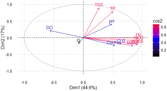 Each measured variable’s contribution to the first and second principal components was calculated as a percentage ((variable_cos2 * 100)/(total_cos2_of_the_component)). The contributions of each variable are presented in Figure 4. The largest contributors to PC1 were COD, TN, BOD5, and MBAS since these exceeded the expected average contribution (represented by the dotted red line corresponding to the expected value 1/100 = 9.09%). Only TSS and TP significantly contributed to the second component (Figure 4). It is common to observe a relationship between the first [45,47,48] or second [49] principal components and organic matter variables (COD and BOD) and an inverse relationship with DO in PCA analyses of basins contaminated by urban processes. However, as Gigues et al. [50] and Pejman et al. [51] demonstrate, different behaviors are found in rural basins.
