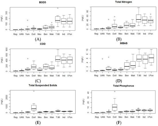 Distribution of values measured at each of the stations in the Tunjuelo River network for BOD5 (A), TN (B), COD (C), MBAS (D), TSS (E), and TP (F). Each of these variables contributed significantly to multi-dimensional variation along the course of the River through Bogotá, Colombia. Station abbreviations are as in Table 1. Values indicated in each of the boxplots are the median (central bar in the box), the interquartile range (the extent of the box), 1.5 times the interquartile range (whiskers), and values in excess of this range (open round symbols).