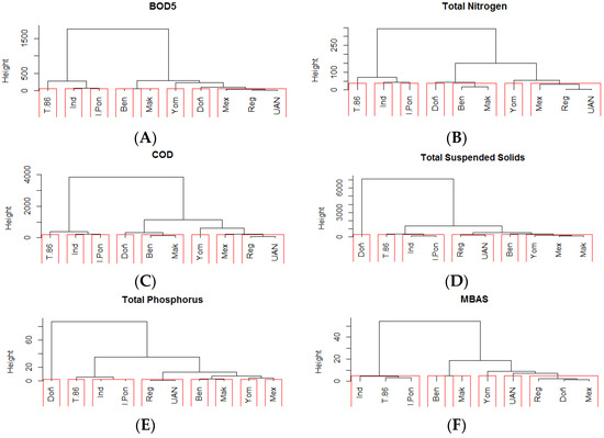 Dendrograms of water monitoring stations in the Tunjuelo River network created in a cluster analysis based on the similarity of the water quality variables biological oxygen demand (BOD5; A), total nitrogen (TN; B), chemical oxygen demand (C; COD), total suspended solids (TSS; D), total phosphorus (TP; E), and methylene blue active substances (MBAS; F).