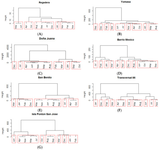 Dendrograms of temporal (month) clusters formed at the stations selected to remain in the redesigned water quality network on the Tunjuelo River. Note that the y-axes of panels are not uniform. January (Jan), February (Feb), March (Mar), April (Apr), May, June (Jun), July (Jul), August (Aug), September (Sep), October (Oct), November (Nov), and December (Dec). (A) Regadera; (B) Yomasa; (C) Doña Juana; (D) Barrio Mexico; (E) San Benito; (F) Transversal 86; (G) Isla Ponton San Jose.