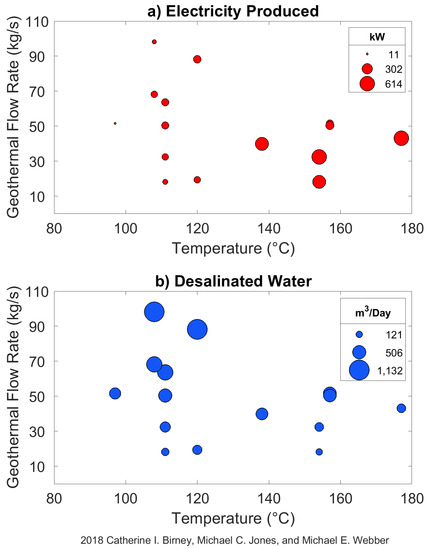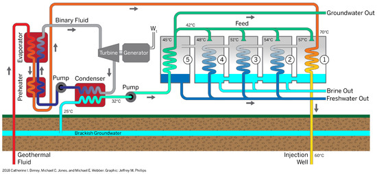 Texas has low-enthalpy geothermal resources with temperatures less than 150 C at depths of 3000–4000 m. Desalinating Texas’ brackish groundwater requires a design for low temperature resources. The framework of this study can be modified to other sites with low-enthalpy resources, but with varying geothermal gradients, salinity, and well depth.