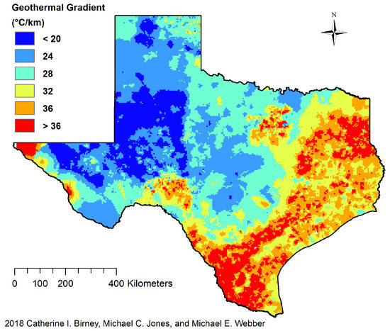 The map of the geothermal gradient of Texas, assuming an ambient air temperature of 20 C, shows that East Texas has abundant resources at relatively shallow depths [27]. The geothermal gradient is the rate the earth’s temperature increases per unit of depth.