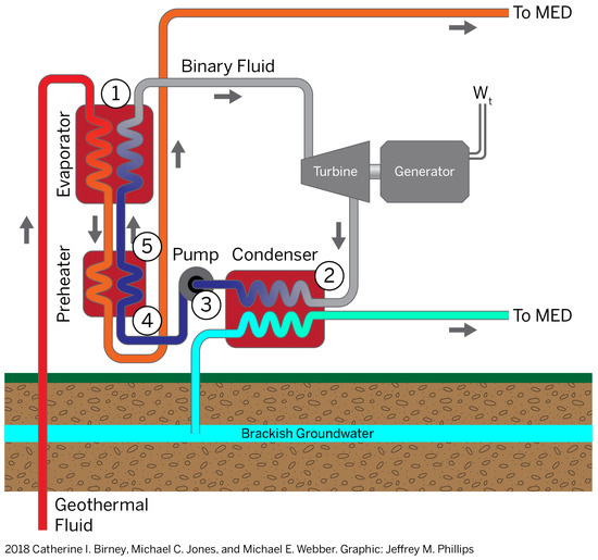 After generating power in the turbine, the working fluid enters the condenser, where it is cooled and condensed by the brackish groundwater flowing to the MED system to be desalinated. Using the brackish groundwater as the coolant accrues two benefits: (1) The brackish water is preheated, which improves throughput in the MED, and (2) the binary cycle is cooled, improving its efficiency, in a way that does not require any freshwater. A binary plant can have either a wet cooling system or a dry cooling system. A wet system condenses the working fluid using cooling water, while the dry system uses air cooling. As the ambient air temperature in Texas is high, 40–50% of the energy produced by the binary cycle would go to cooling the system [23]. Therefore, a wet cooling system is better suited for Texas’ climate, though it could exacerbate water scarcity issues.