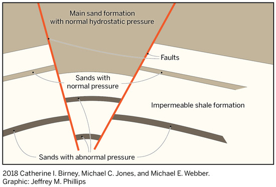 Conceptual model of geopressured sediments adapted from [31]. Faults hydraulically isolate porous strata while sediment overburden accumulates, resulting in the increase of reservoir pressure and temperature.
