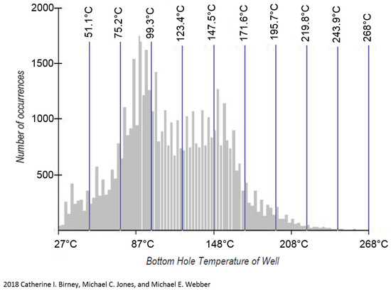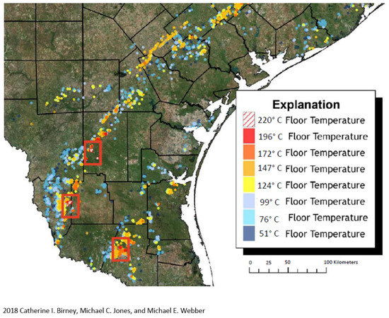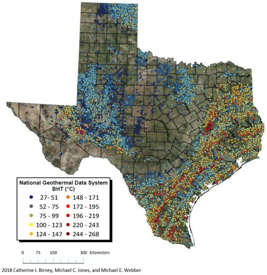 A geospatial distribution model was created to quantitatively determine the most suitable locations for a theoretical geopressured geothermal energy production system known as a well bore heat exchanger [40]. Bottom hole temperature data from 42,601 wells are displayed in Figure 6.