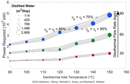 The energy requirements for pumping the geothermal and brackish groundwater are determined from Equation (8). The pumping requirements are based on depth to source water, , pump efficiency, , and the capacity factor of the system, , assumed to be 95% for this analysis. The energy requirements for the system can be drastically reduced if the geothermal water is from a geopressured reservoir, where the water flows freely to the surface and does not need to be pumped.