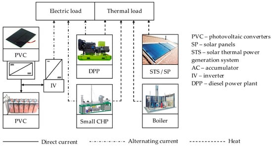 The trajectories described above build upon the idea of the transition to zero-waste energy production, which involves the utilization of energy resources in a closed cycle starting with primary raw materials, on to production and consumption, and ending with secondary raw materials (Figure 1). In the context of the first trajectory, it seems reasonable to use the technology of fluidized bed combustion as it increases the generator efficiency, ensures environmental safety of power production, and makes it possible to recycle leftover ash in the production of construction materials. Another option is to minimize waste by creating so-called off-the-grid power systems (Figure 2) that could consist of photovoltaic converters, a small-scale wood-chip-fired combined heat and power (CHP) plant, a diesel power plant, a pellet-burning boiler house, and other equipment [,].