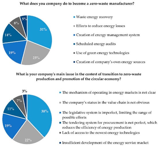 The conducted survey made it possible to identify the most common and “less popular” problem-prone areas in the development of zero-waste energy production in manufacturing. The use of recovered energy and reduction of energy losses under load conditions and in distribution lines could be classified as category one. One of the problem-prone areas is the process of decision-making on entering energy markets (Figure 3).