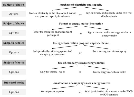 The authors define energy market strategy as a tool of implementing the principle of “rational behavior”. This tool is of practical value for the energy management of enterprises in determining the direction of actions to use the opportunities of the energy market that have different options and scenarios (Figure 4).