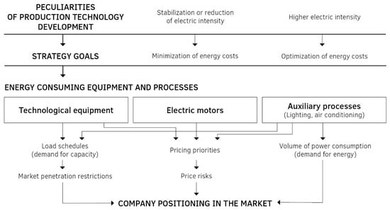 Demand for electric power at a manufacturing company can be divided into three blocks that each cover specific consumers: groups of energy-consuming equipment and processes. Consequently, the strategic goals of the buyer will differ in relation to individual energy-consuming processes. For example, cost optimization matches the peculiarities of technology-determined consumption that allows for electrification expansion (for example, furnaces can be powered by both electricity and gas). In this case, it is desirable to receive electricity at a stably low price. The goal of cost minimization applies to electrical equipment and lighting, as electricity is practically the no-alternative energy carrier powering them; hence, higher prices generally encourage power conservation.
