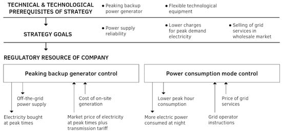 Combined strategy (Figure 6). The strategy is named “regulatory consumer”. A company that pursues the strategy buys electricity (capacity) in different markets and also offers and supplies its regulatory resource in the technology services market. Two schemes could be activated within the framework of the strategy: one involving controllable sets and another one utilizing backup generators for meeting peak demand.