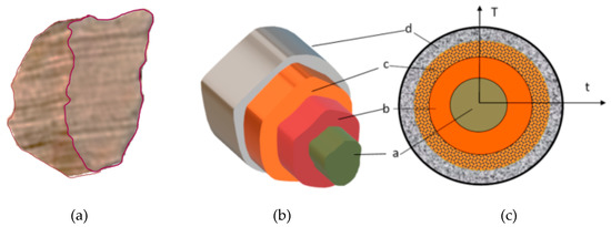 Four layers in a molecule (t = time, T = K). (a) The base material, (b) Pyrolysis, (c) Volatile materials, carbon layers (gases and volatile materials within).