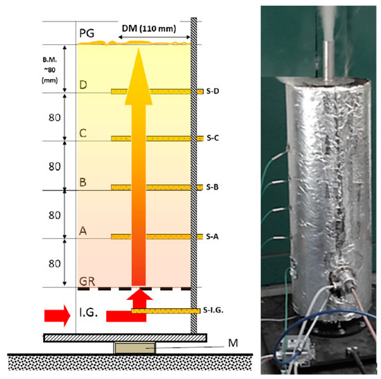Main measurements and sensors of the measurement unit (outbound unit). (Main attributes, according to Figure 3: I.G—intake of heated inert gas under the GR (grid) support bars, where; S-I.G—the temperature sensor was also placed, A, B, C, and D heights hosted (S-A)—(S-D) temperature sensors; Above S-D sensor, another 80 mm mass height can be found, above which is the PG gas’s exhaust opening (for sampling and the exhaust torch); M—precision scale).