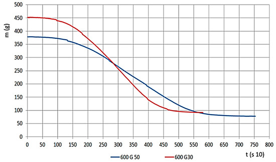 For the material with smaller grains, meaning larger volume density, mass change time was shorter, and the mass decrease velocity was significantly higher (Figure 8). If we look at the percentage, the remaining char is less (ms, 10–22%). The results on the Figure show the G30 and G50 hardwood chips’ decomposition results on a temperature of 600 °C.
