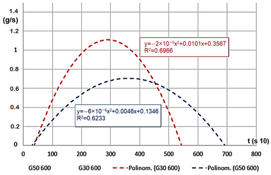 The material density of G30 and G50 chips are different because G50 has smaller density values. Therefore, within the measurement area of the apparatus, we could load in a smaller amount of material. Therefore, we watched the relations between changes, both for mass change velocity and for determining pressure values for gas flow, this is presented on Figure 7, for G30 and G50 hardwood materials on 600 °C.