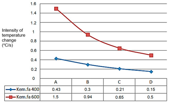 The A, B, C, and D points’ temperature sensors measured the temperature values, which can be seen in the next Figure 9, starting from point A. The temperature change shows a similar tendency for the higher temperature’s higher intensity temperature change value for 600 °C and the lowest point for 400 °C where the heated inert gas was filled in (Figure 9).