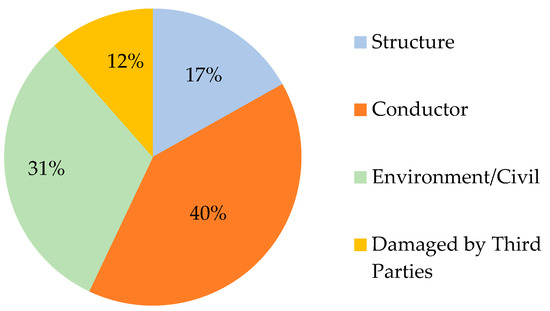 In Peninsular Malaysia, the conductor length of overhead transmission lines span more than 532,403 km and there are 74,417 distribution substations operated by the electric power utility company, Tenaga Nasional Berhad [1]. Based on the Malaysia Energy Commission, the energy demand by the consumer consists of 81% to the domestic sector while 17% to the commercial sector and 0.3% to the industrial sector. The electrical power coverage on the Peninsular Malaysia is about 99.8% [2]. Assessment of overhead transmission lines is crucial in the asset management of energy infrastructure. Any failure related to electrical power distribution and transmission components will cause interruption to power supply. Based on a 2016 statistical report on electricity performance in Malaysia, the percentage of unscheduled supply caused by environment was 12.94% for low and medium voltage interruption [1]. Figure 1 shows the compilation of performance report from the Malaysia Energy Commission from 2000 to 2016 [1,3,4,5,6,7,8,9,10,11,12,13]. The disruption caused by environment was 31%, 17% was caused by structure failure, 40% was caused by conductor problems and disruption caused by a third party was 12%.