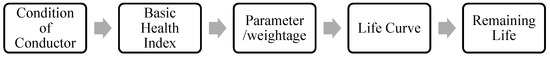 However, Tsimberg et al. in Reference [16] show the condition of the conductor can be expanded to identify the remaining life. The process of determining the condition of the conductor is based on Figure 3. The determining of the condition of the conductor divides into two, a basic health index and comprehensive health index. The basic health index is considered as physical condition, service record parameter and the de-rating factor. The de-rating factor appears once the data shows the presence of any repairs or splices, while the parameters of the comprehensive health index formula are mechanical properties, physical properties, service record, repairs/splices, and remaining tensile strength.