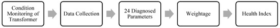 In addition, a different method of finding the health index which was introduced by German et al. in Reference [26]. The health index was calculated by determining the criticality failure of the parameter in the component of the asset. The studies on the transformer show that a higher rate of failure of the component will give a higher percentage in the finding of the health index. Figure 5 shows the process of determining the health index of the transformer by using the 24 diagnosed parameters used by German et al. in [26]. The health index relies on 24 diagnostic parameters. This formulation of finding the health index is widely used in the finding of the health index of the transformer [19,20,27].