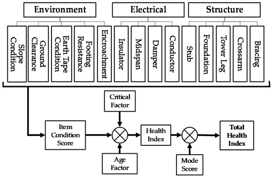 Thongchai et al. in Reference [14] presented a method to determine the health index based on the condition assessment of the overhead transmission lines. The process of determining the health index is shown in Figure 2. The component categorized by four which are foundation, structure, conductor, and insulator. The condition of these four components was assessed. After the assessment conducted by patrolmen, the condition of the components was identified. The calculation of the health index was based on the checking list document which was used by the patrolmen to inspect the overhead transmission lines.