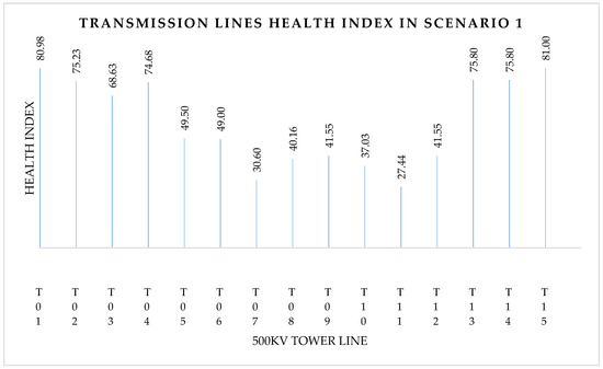 Figure 7 shows one of the health indices for the transmission line in the scenario 1. The case study in this scenario lies in the industrial area. The length of transmission lines depends on the range of substation to another substation. The results of transmission lines in the scenario 1 indicate that eight towers in the transmission lines are in poor condition, two towers are in fair condition and five towers are in good condition. The overall condition of transmission lines is calculated based on the median of all the health index in the transmission line. From the graph, the overall condition of transmission lines calculated in the scenario 1 is 49.5% where the condition is classified as poor condition based on ranking and indication in Table 2.