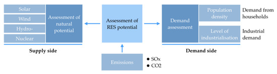 - X-axis—potential of a source (solar: average annual irradiance (kW/m2); wind: average annual wind speed (m/s); small-scale hydro potential (MW))